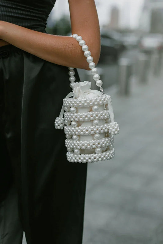 Elegant Pearl Bucket Bag with Drawstring Pouch – Perfect for Special Occasions