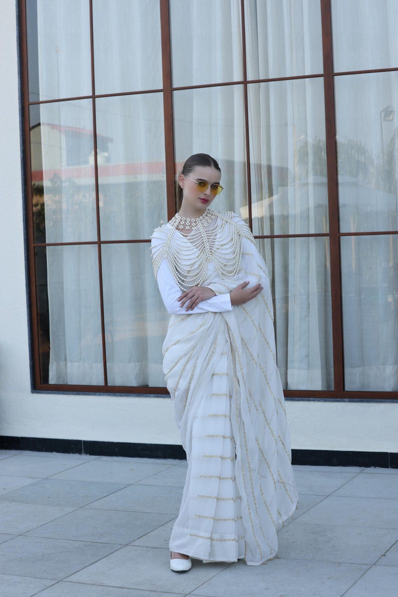 • Sheer or satin sarees – to enhance the celestial pearl flow